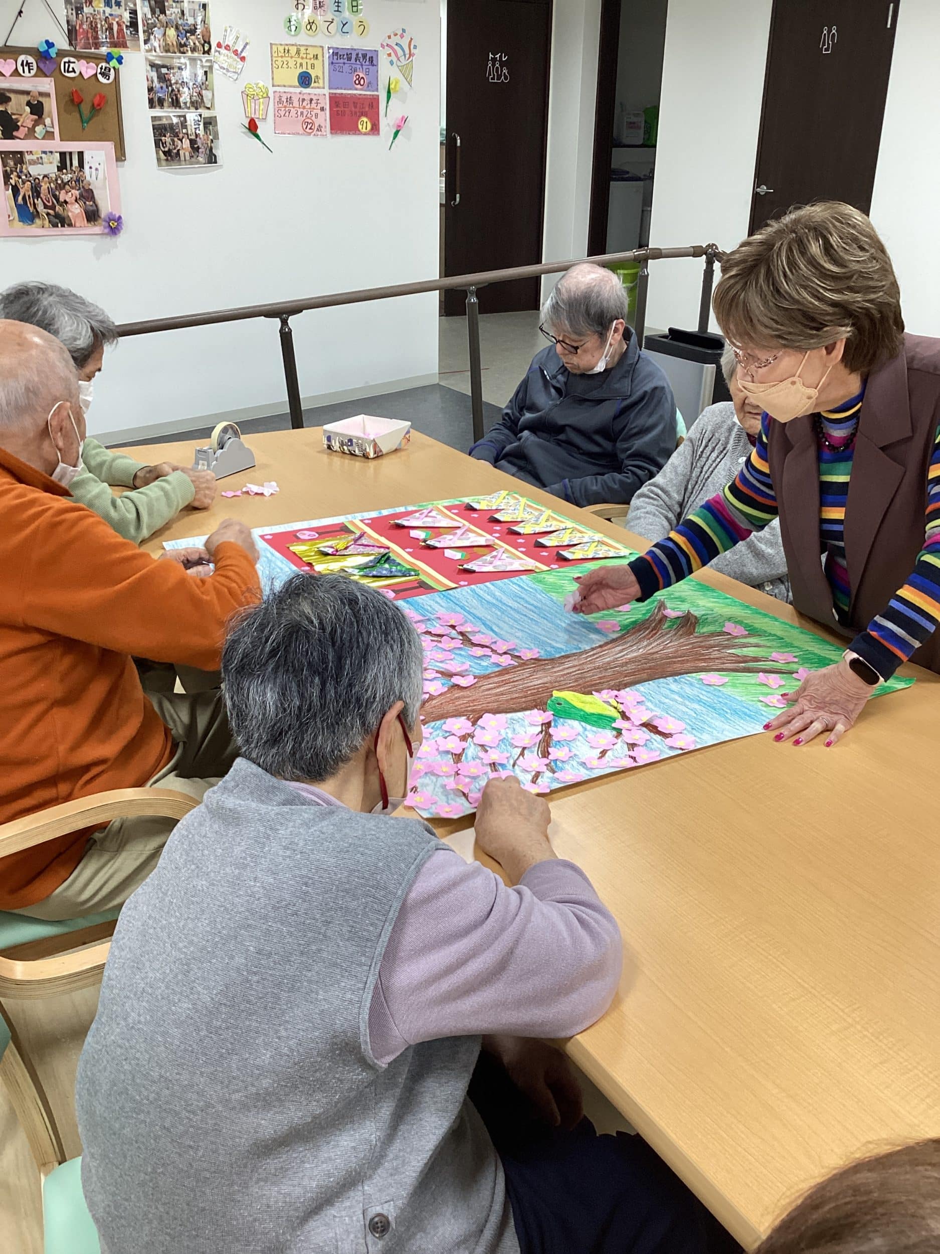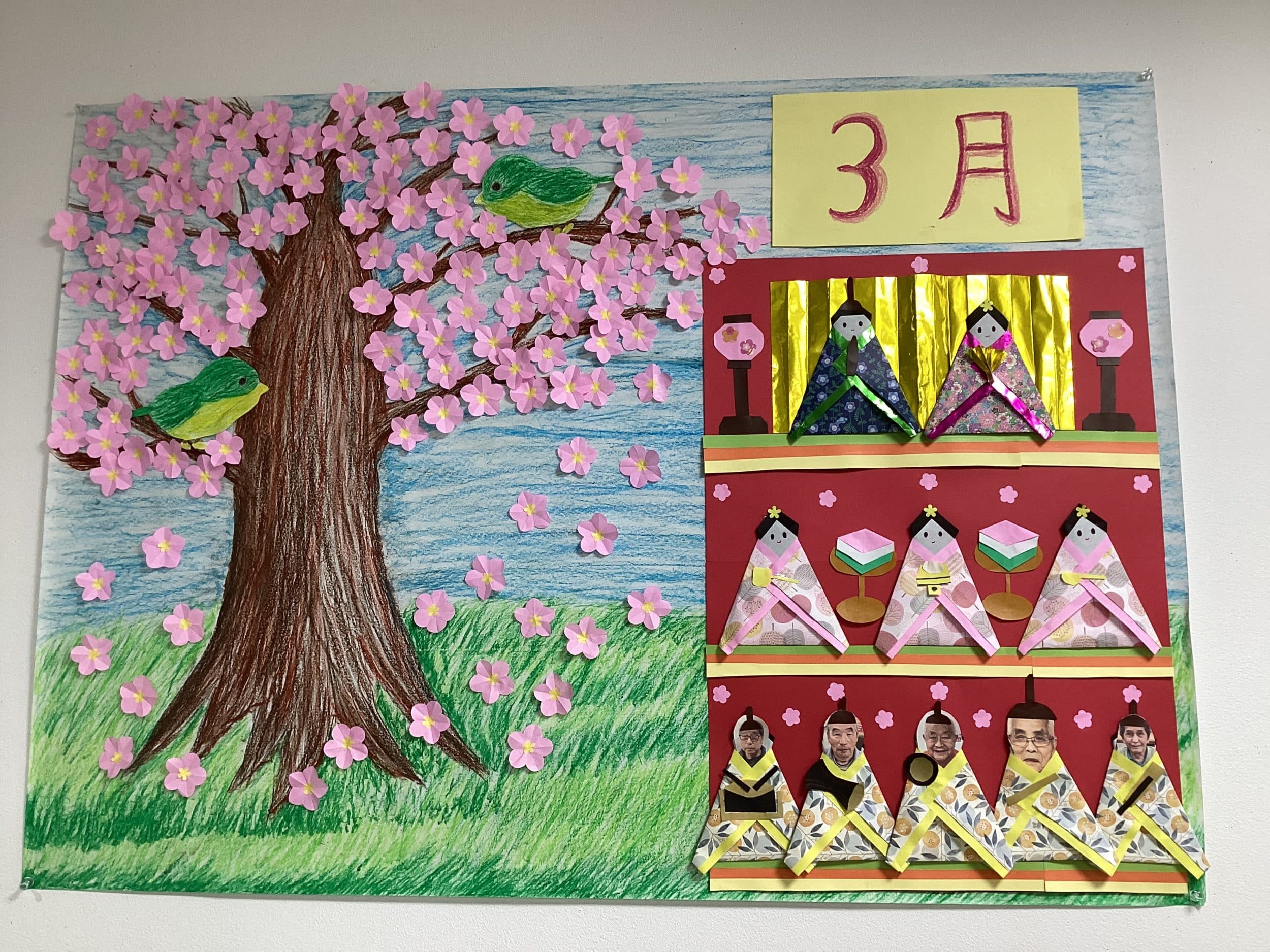 デイサービス、レクリエーション【デイサービスやまちゃん】3月壁画の作成風景☆ Posted on 2026.03.032026.04.07 by matudukien_staff 3月の制作風景です(^^) 今回は先月作成した風景画を元に、お花を入れ替えて作成してみました。 2月の梅の花を外して、桃の花に変更です。 右側にはひな人形を作成しました! 「五人囃子」のお顔をよ~く見てみると・・・・ 男性ご使用者様の顔が♡♡♡ 日替わりで入れ替えることで、皆様大喜びでした\(^o^)/ 。 【デイサービスやまちゃん】あん巻き作り ☆2日目☆ 🎎ひな祭りカラオケ大会を開催しました🎤
